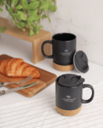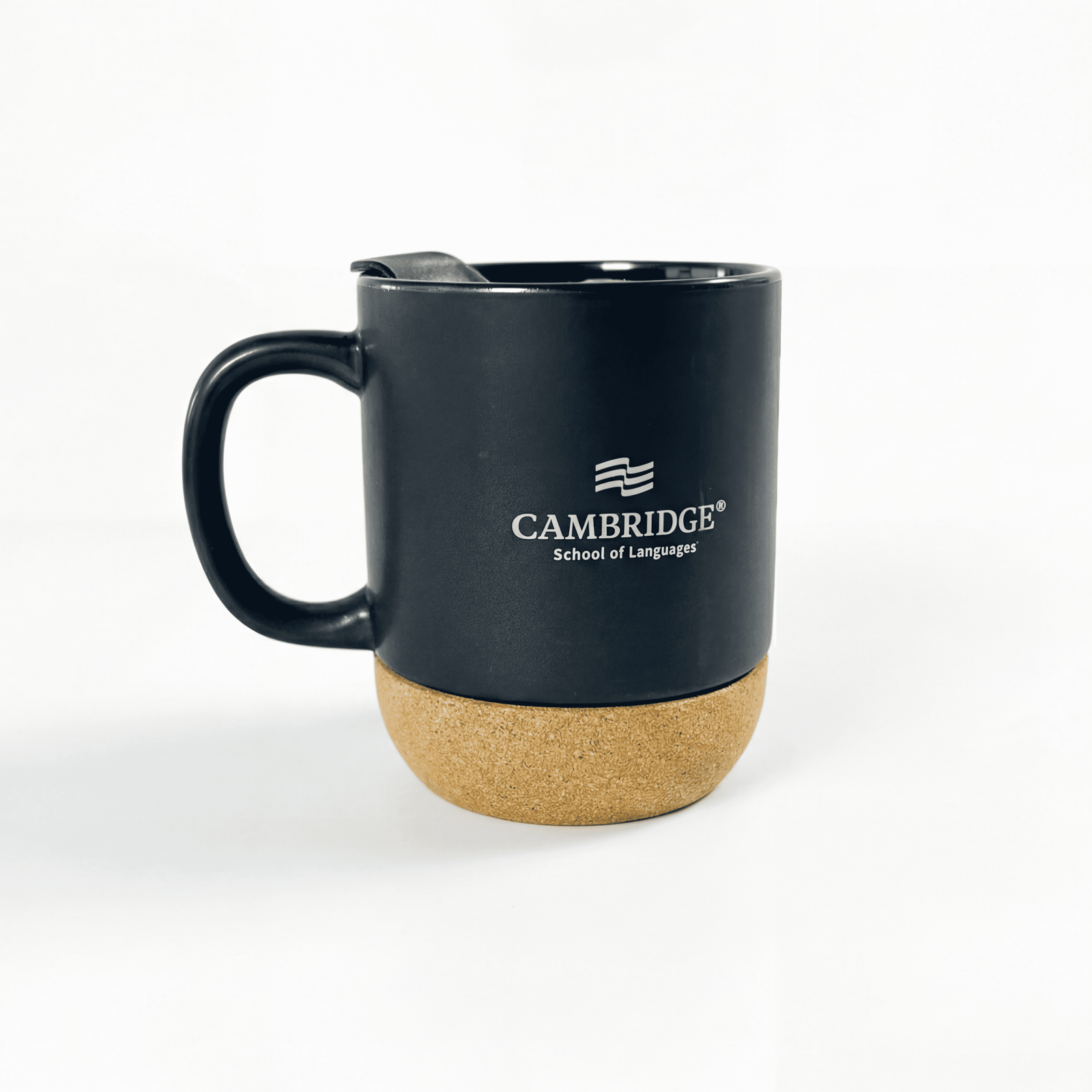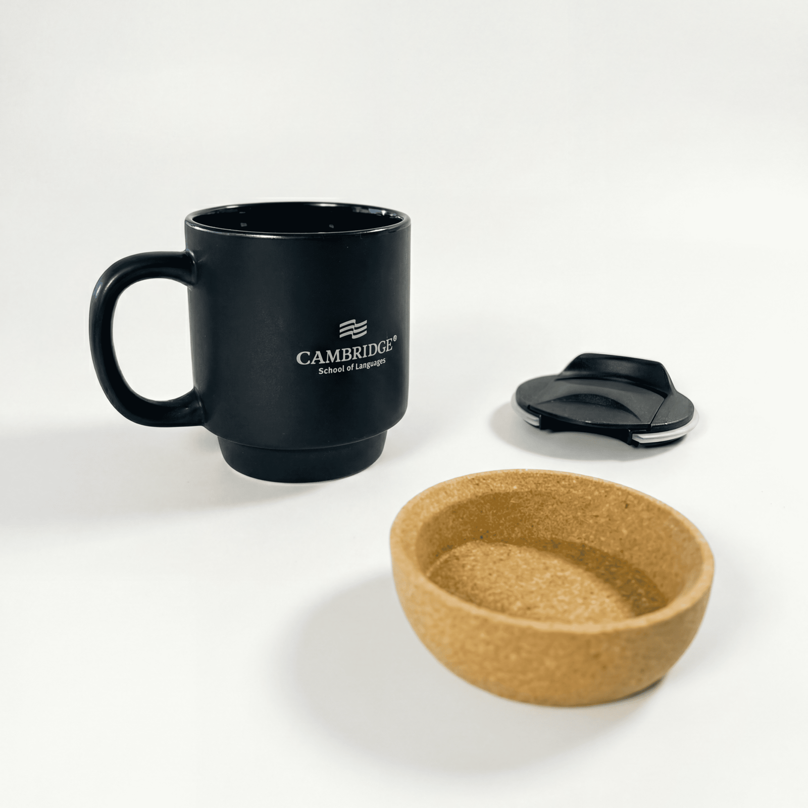 Mug negro Cambridge School of Languages con diseño elegante y base tipo corcho desmontable. Incluye tapa superior. Ideal para oficina, escritorio o uso diario con estilo profesional.