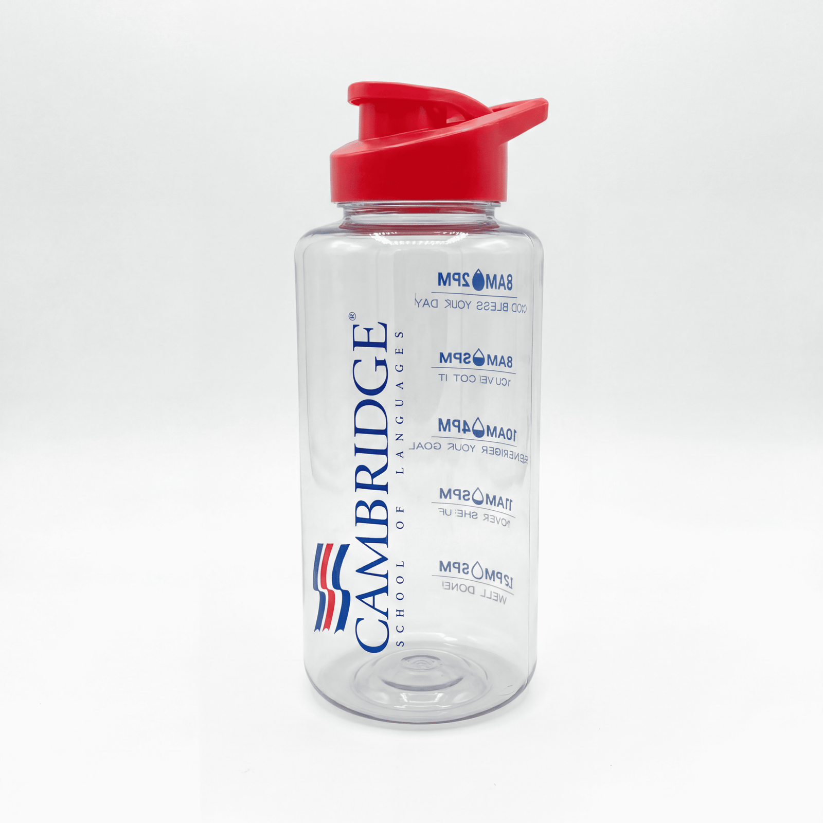 Tomatodo transparente Cambridge con marcador de horas para motivar la hidratación diaria. Liviano, práctico y perfecto para estudiantes y actividades deportivas.
